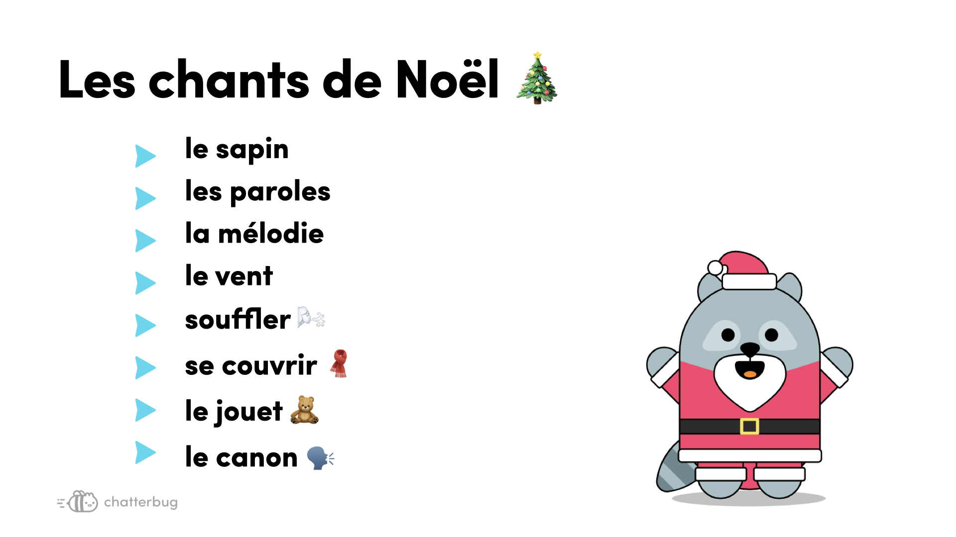 - "Mon beau sapin" ("O Tannenbaum") : "Mon beau sapin 🌲, roi 👑 des forêts, que j’aime ta verdure 🟢!" -