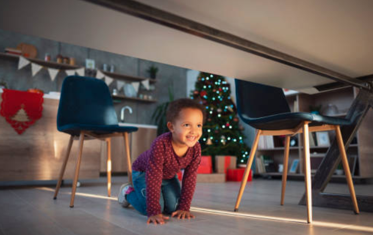 2️⃣ Le plus jeune enfant 👶 se place sous la table et désigne le destinataire des parts.