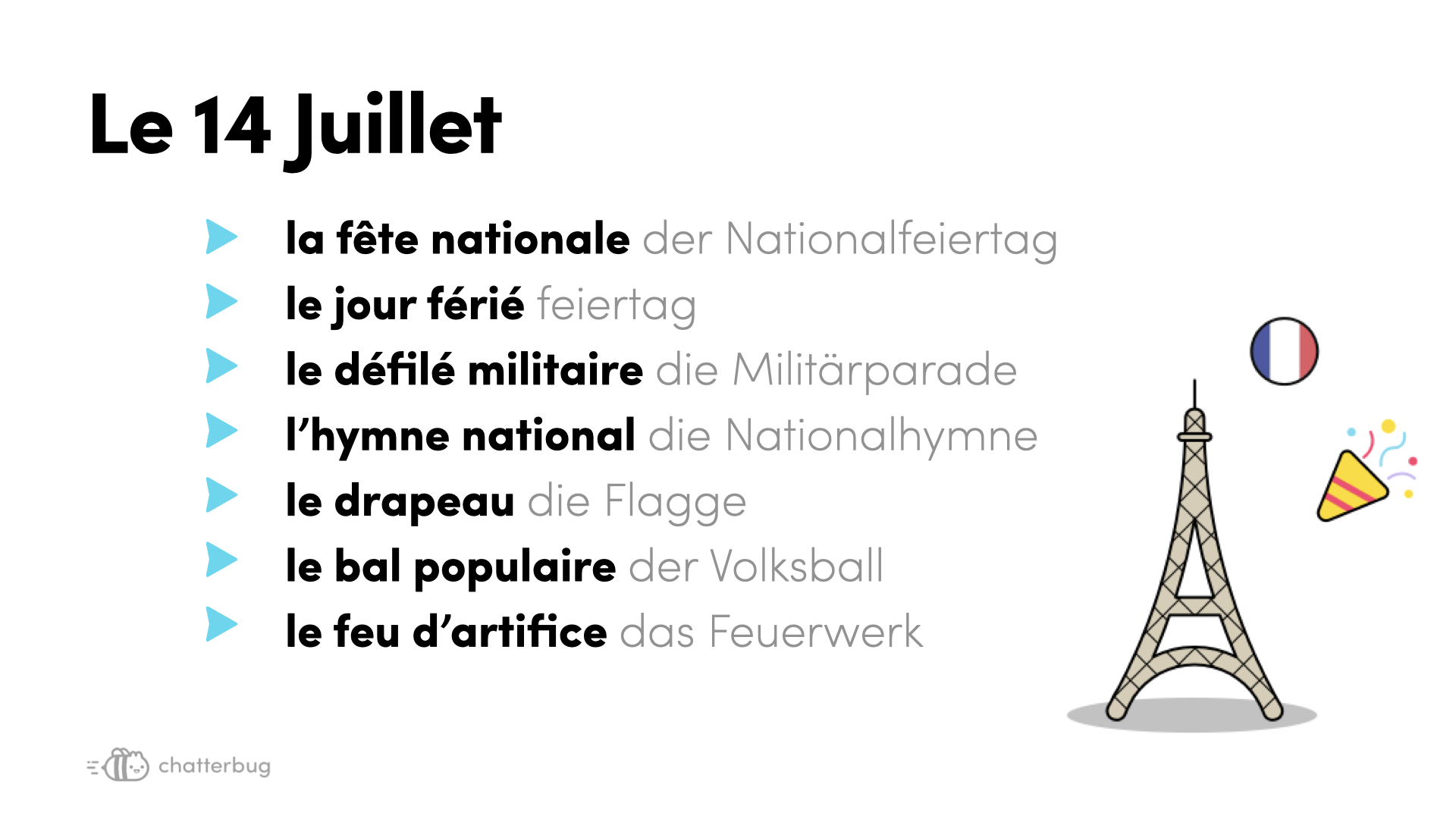 "Tag der Bastille"? Möchtest du erfahren, wie die Franzosen:innen ihren Nationalfeiertag nennen und welche Aktivitäten sie an diesem Tag unternehmen? Machen Sie mit!