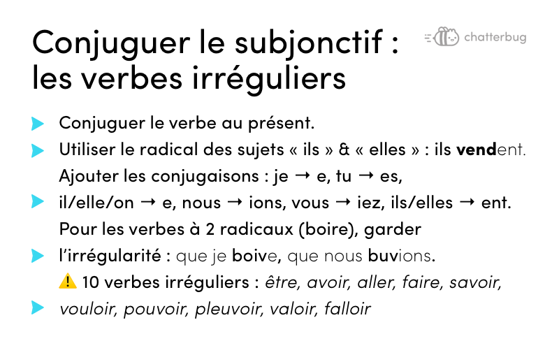 Attention, les verbes irréguliers se conjuguent différemment au subjonctif !