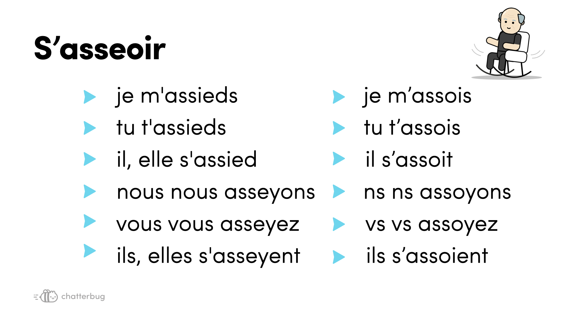 - 2:40 > la conjugaison du verbe "s'asseoir"
