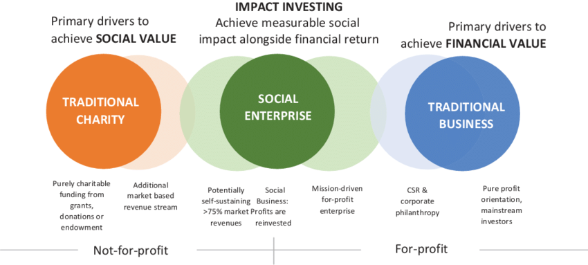 -Positive social and environmental change alongside a steady revenue. Sells a good or service. Revenue goes back into initiatives (except repayment to investors). Self-sufficient. Not tax exempt.