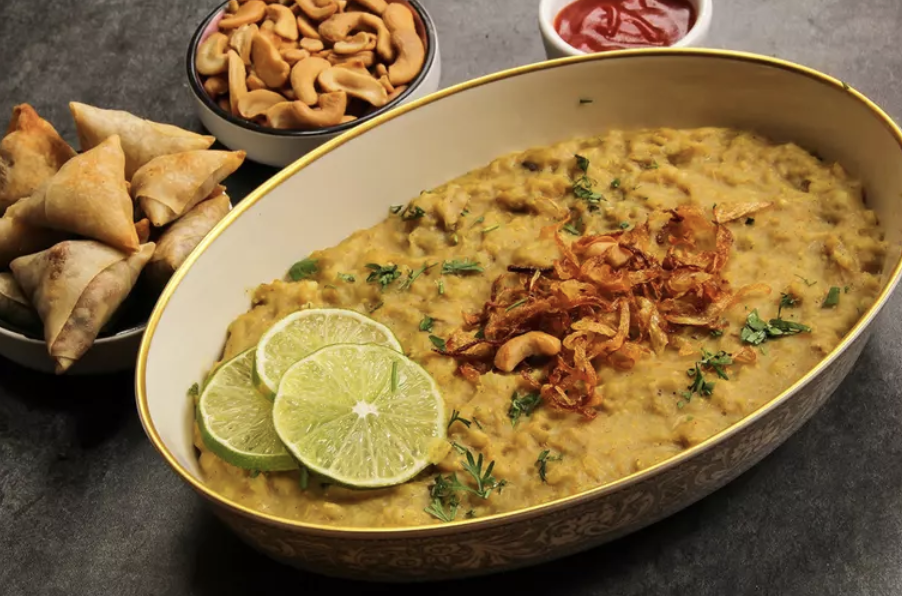 Stew with wheat, barley, beef/mutton, lentils, spices, and sometimes rice