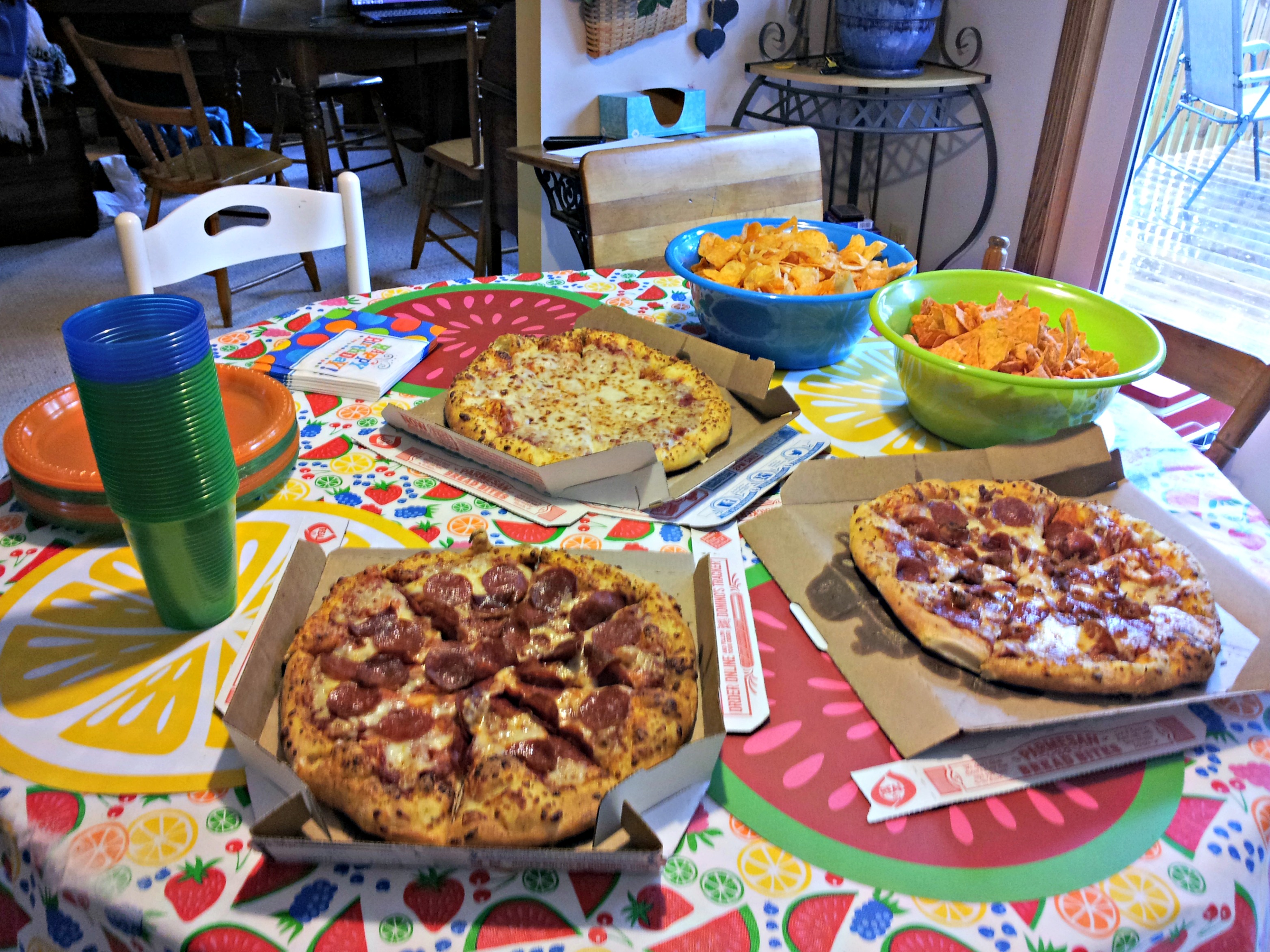 Viele Leute essen Pizza auf ihrer Geburtstagsparty.