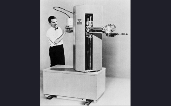 In den frühen 1940er Jahren prägte der Science-Fiction-Autor Isaac Asimov den Begriff Robotik. Hier abgebildet ist der Unimate, der erste Industrieroboter. Das Konzept für Unimate wurde vom Erfinder George Devol entwickelt, der im August 2011 im Alter von 99 Jahren starb. General Motors kaufte das Gerät und installierte es 1961 am Fließband.