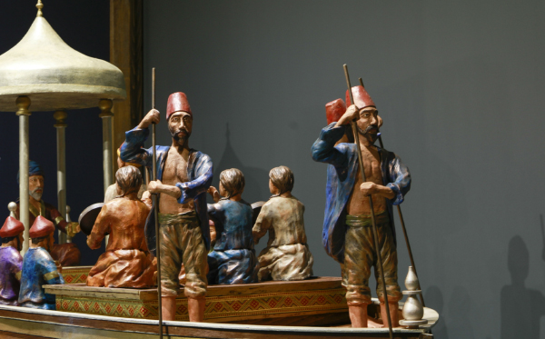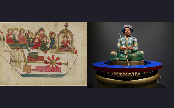 Al-Jazari war ein irakischer Erfinder, der während des islamischen Goldenen Zeitalters lebte. Hier abgebildet ist seine Robot Band, ein „Boot mit vier automatischen Musikern, die auf einem See schwebten, um Gäste auf königlichen Trinkpartys zu unterhalten“.