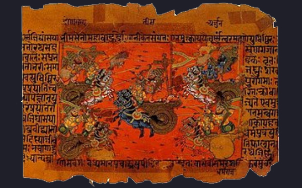 Krishna führt als Wagenlenker Arjuna in die Schlacht, der im 13. Jahr aus dem Exil zurückkehrt. Die Erzählung ist voll der Bezüge zur hinduistischen Philosophie, insbesondere im Kernstück Bhagavad-Gita.